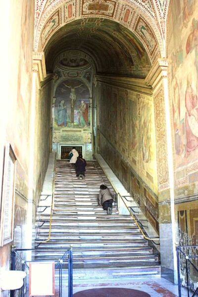 Pilgrims often walk on their knees in ascending the Scala Sancta as an act of penance and a sign of union with the humble Jesus. Notice the massive fresco of the Crucifixion at the top of the stairs.